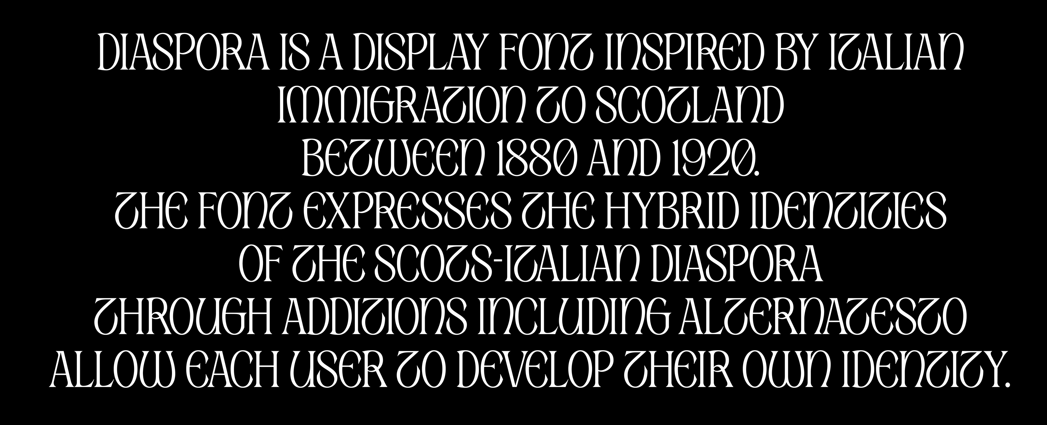 Diaspora is a distinctive display font that pays homage to the Italian immigration to Scotland between 1880 and 1920. This font uniquely captures the hybrid identities of the Scots-Italian diaspora by offering seven alternate glyphs for letters A, E, M, N, T, U, V, and W. These alternates empower users to craft their own typographic identity.
